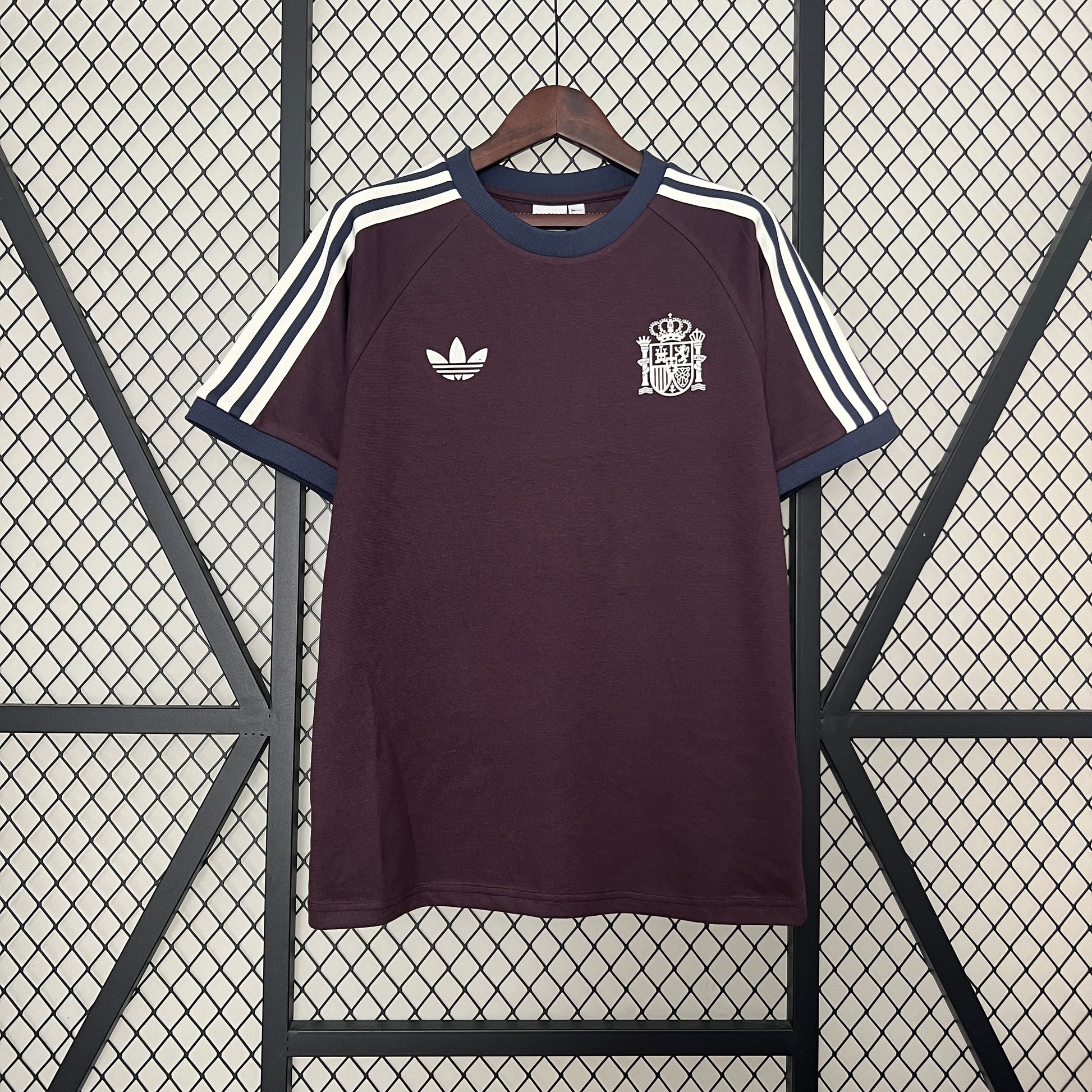 Confeccionada en tejido de alta calidad, esta camiseta ofrece comodidad y un look vintage único. El color vino oscuro con detalles en azul marino y las tres bandas blancas en los hombros la convierten en una pieza imprescindible para coleccionistas, fanáticos del fútbol y amantes del estilo retro.